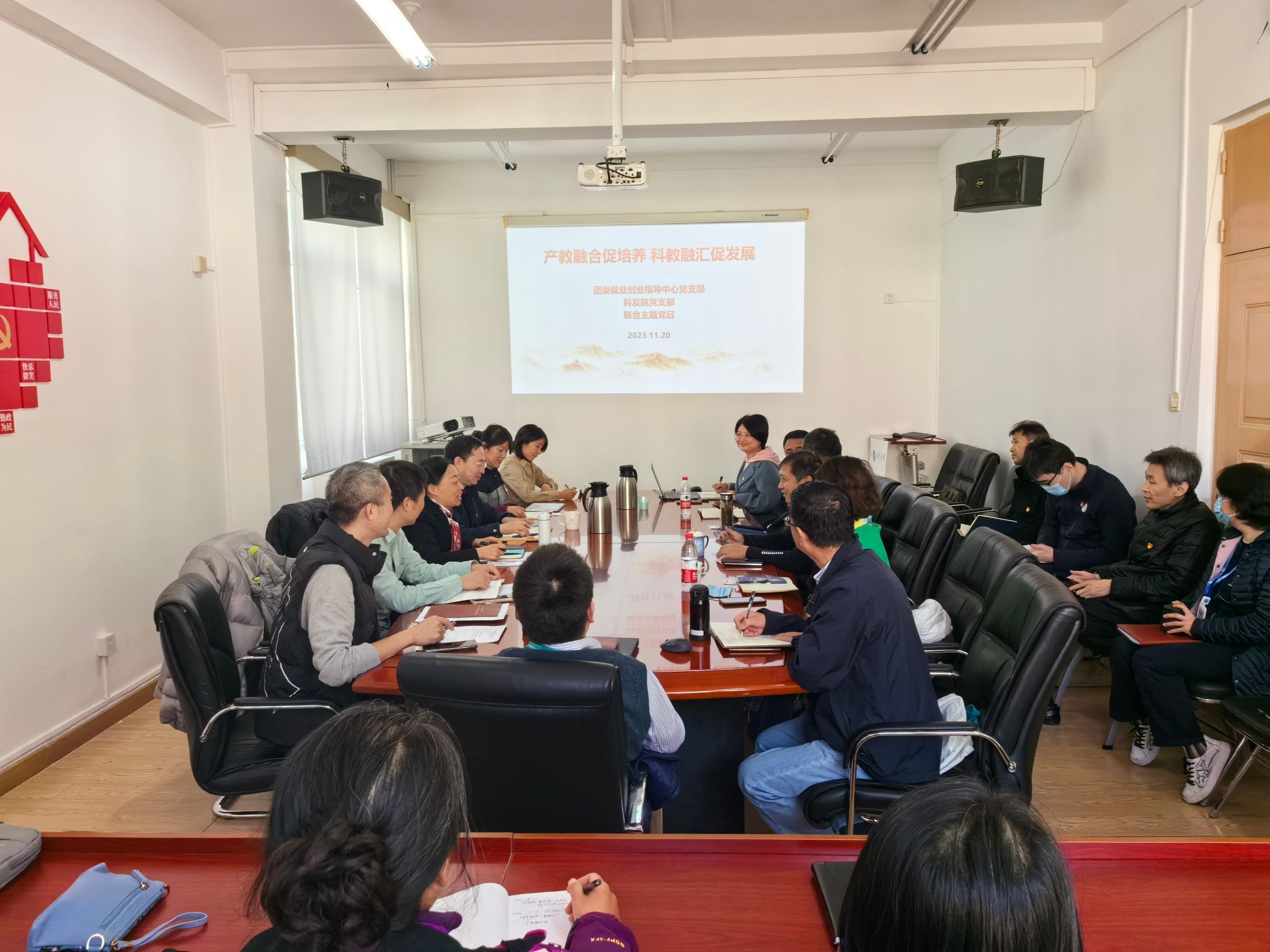 11月20日上午,团委就业创业指导中心党支部、科发公司党支部在知新园402会议室联合开展“产教融合促培养 科教融汇促发展”主题党日和理论学习活动,团委就业创业指导中心党支部书记王丽梅主持活动。