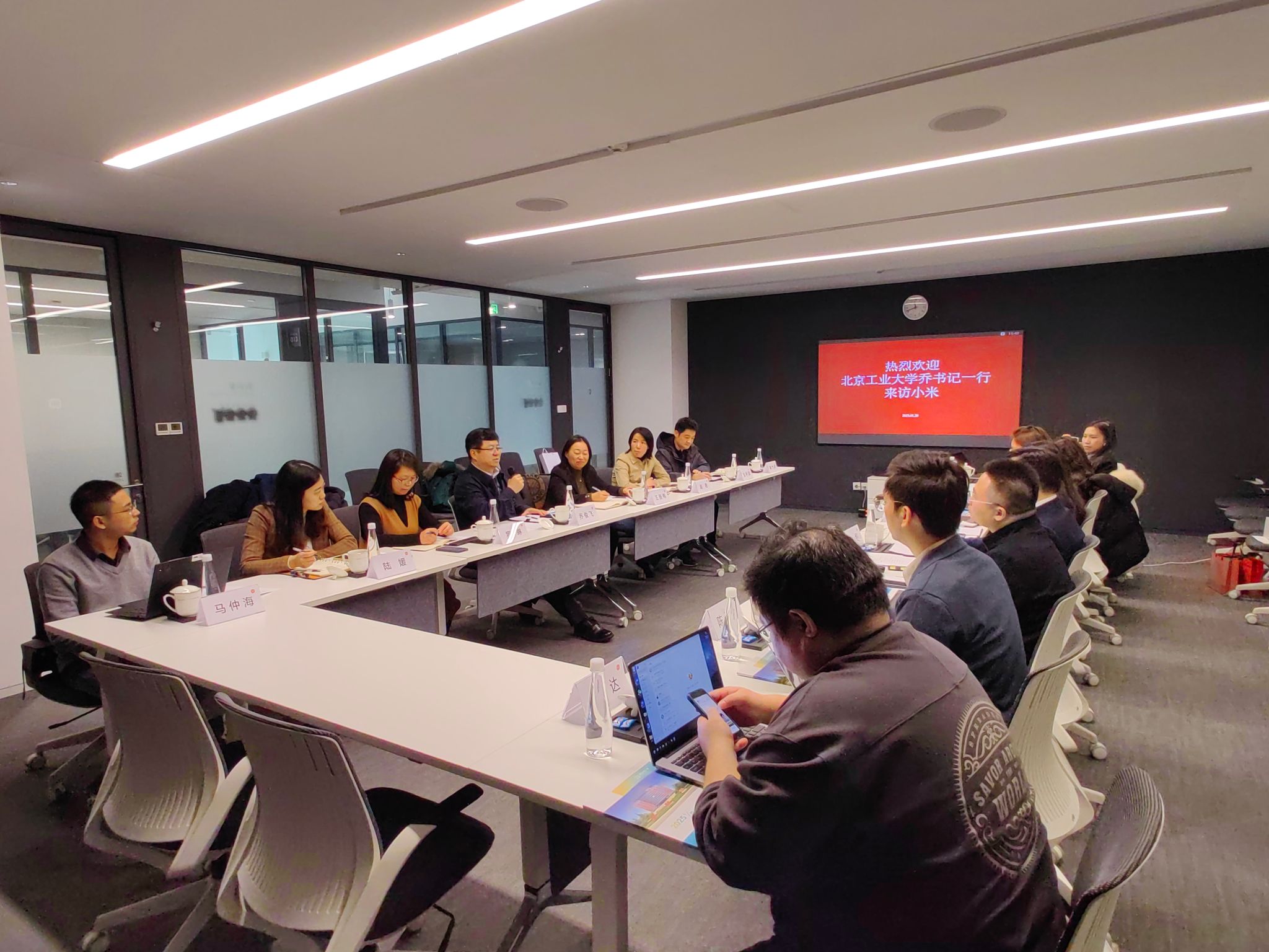 校企双方介绍情况并回顾了近年来在创新人才培养、科学研究、就业等方面的丰硕成果。2021年全国高校首家小米创新创业工作室落户在北工大,签订工作室合作协议,打造“校园+头部企业”协同培养创新人才的标杆示范。2023年,北工大信息学部本科生团队勇夺小米集团首届AIoT开发平台创新赛全国总决赛冠军。2024年,公司与小米集团联合申报获批“北京市本科高校产学研深度协同育人平台”,多名北工大教师获得北京市自然科学基金-小米创新联合基金及教育部产学研协同育人项目资助。近3年有60多名北工大毕业生入职小米集团。双方围绕协同育人平台建设、人才培养机制创新、科研合作,员工就业等方面展开广泛而深入的讨论,共同探索未来合作的新方向与新机遇,力求在现有合作基础上实现更大的突破。