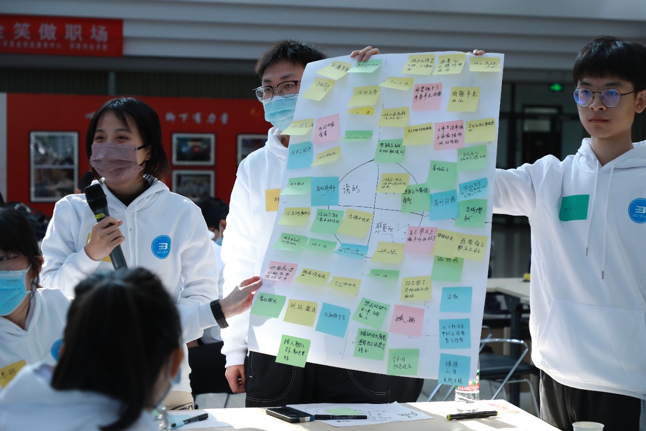“老师通过一个个互动小游戏,做到了寓教于乐,通过模拟情景,让我们在实践过程中真正做到换位思考。同时小组想法碰撞的过程也很有趣,我们一起用便利贴贴出自己的一个个idea,一起动手将我们的想法拟成模型落地,我感受到了大家一起头脑风暴的快乐。”